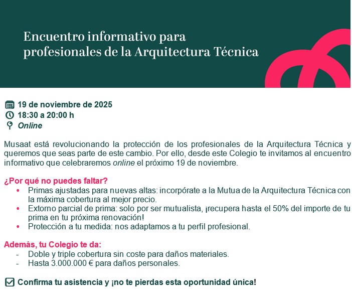 MUSAAT organiza un encuentro informativo donde se presentarán las principales novedades de las pólizas de Responsabilidad Civil Profesional para el 2026, así como las ventajas de formar parte de la mutualidad para las nuevas personas colegiadas.
